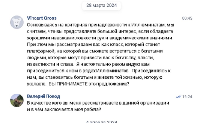 - В 2024 году снова было предложение, но уже другому члену АННО «Международной академии наук» о вступление в орден иллюминатов и в этот раз я сохранил и сделал все скрины переписки.