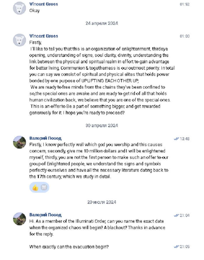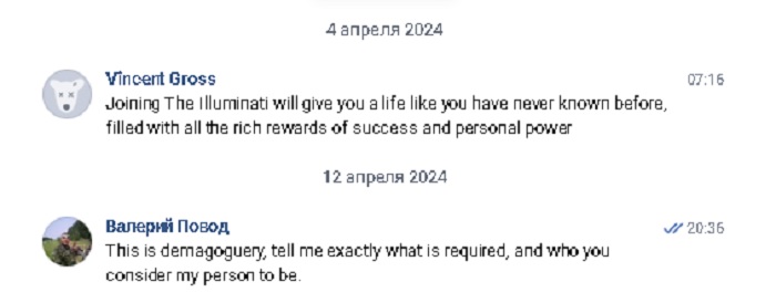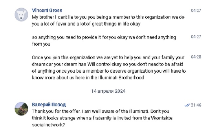 «Thank you for the offer. I am well aware of the Illuminati. Don't you think it looks strange when a fraternity is invited from the Vkontakte social network?