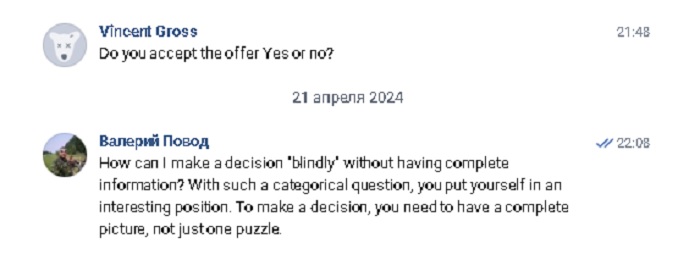 Дальше продолжил диалог наш представитель, пытаясь понять, что от него хотят лично: